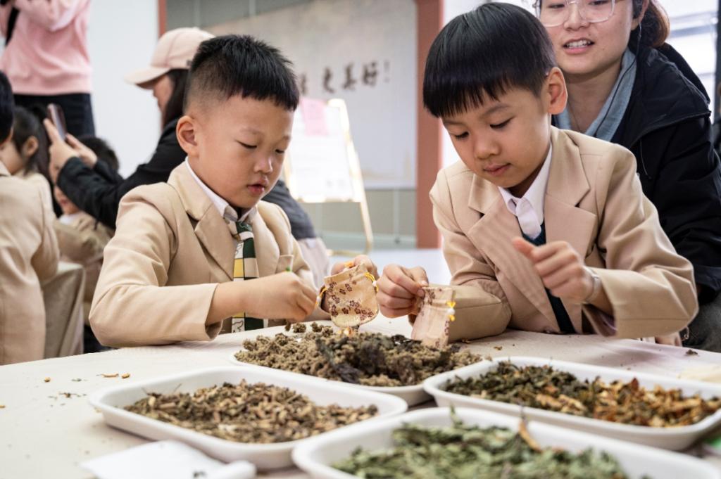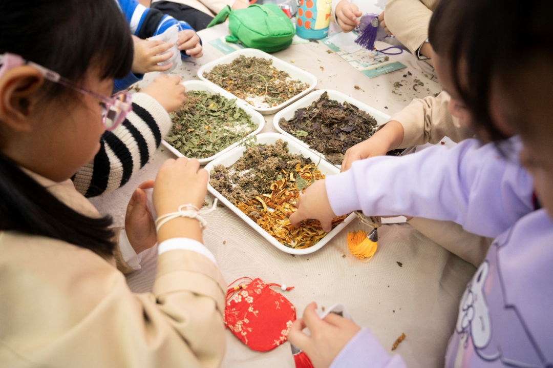 活动在中药香囊制作环节来到高潮,孩子们在专业老师的带领下闻香识药、动手操作,有的小心翼翼挑选搭配药材,有的互相帮助,最终完成了满载草本清香的香包。孩子们举着作品,脸上洋溢着成就感,纷纷表示要将这份“草本小礼物”带回家。